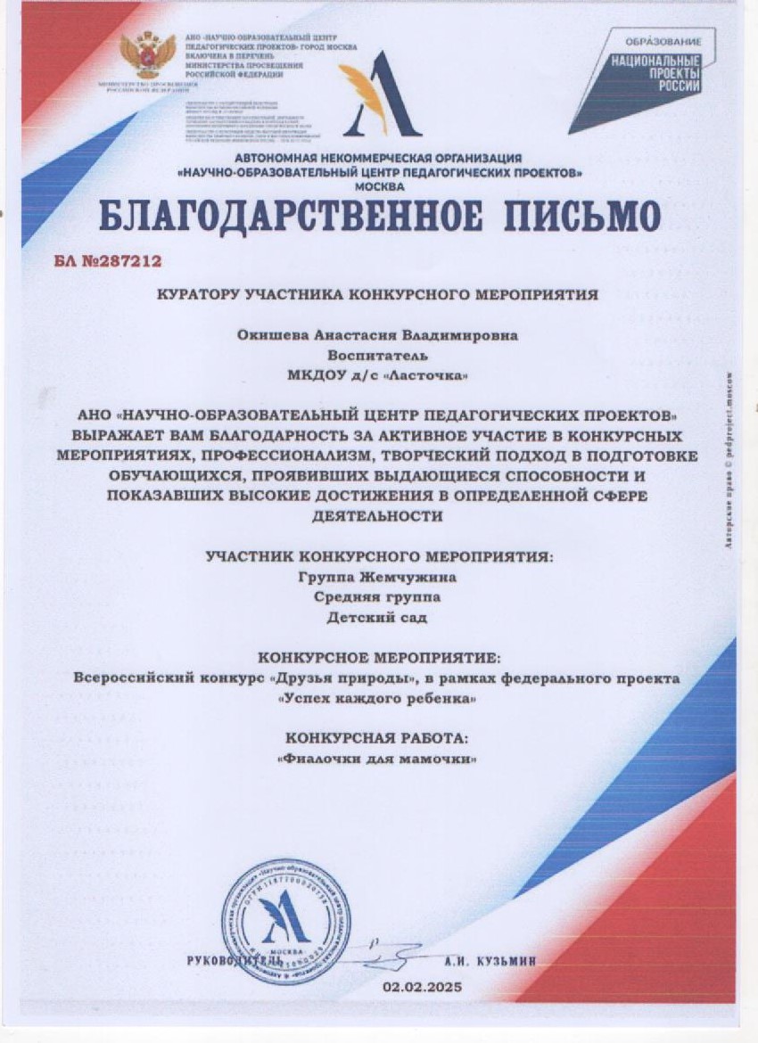 Благодарственное письмо Автономная некоммерческая организация "Научно-образовательный центр педагогических проектов" Москва