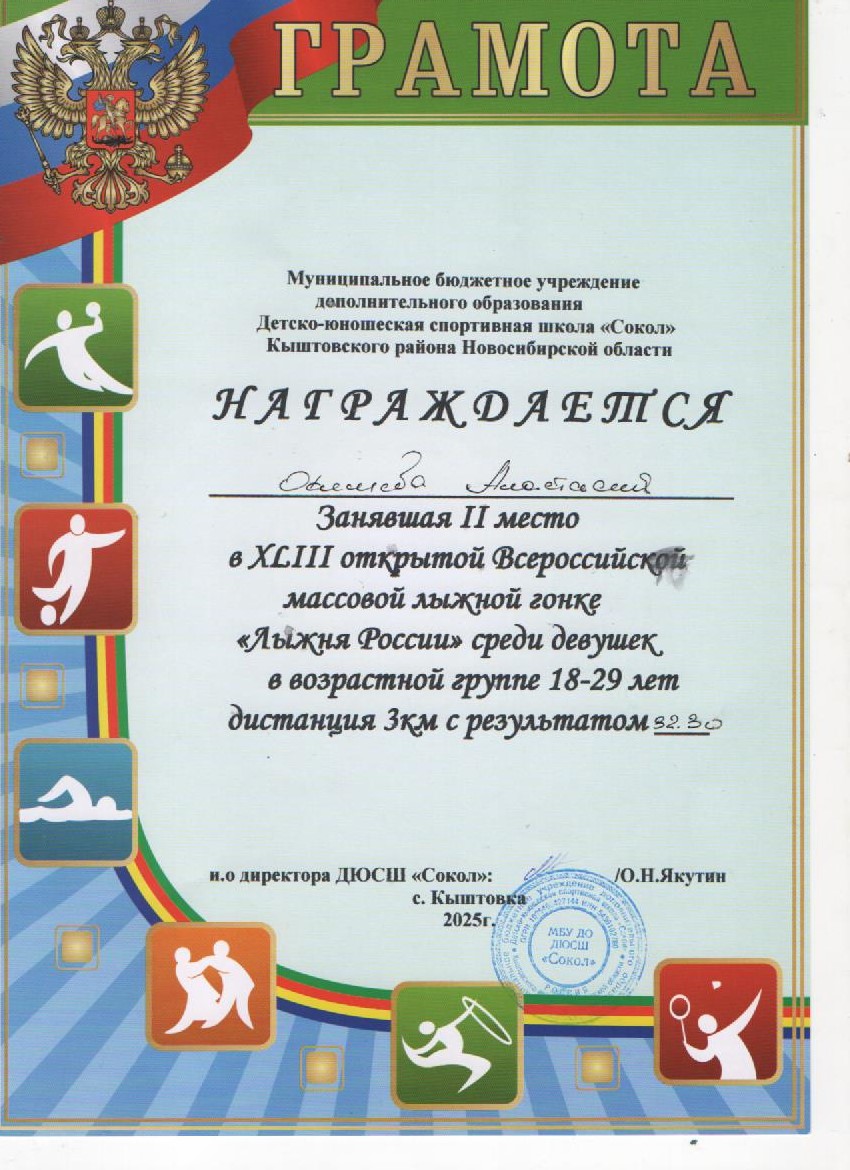 Грамота Муниципальное бюджетное учреждение дополнительного образования Детско-юношеская спортивная школа "Сокол" Кыштовский район Новосибирская область