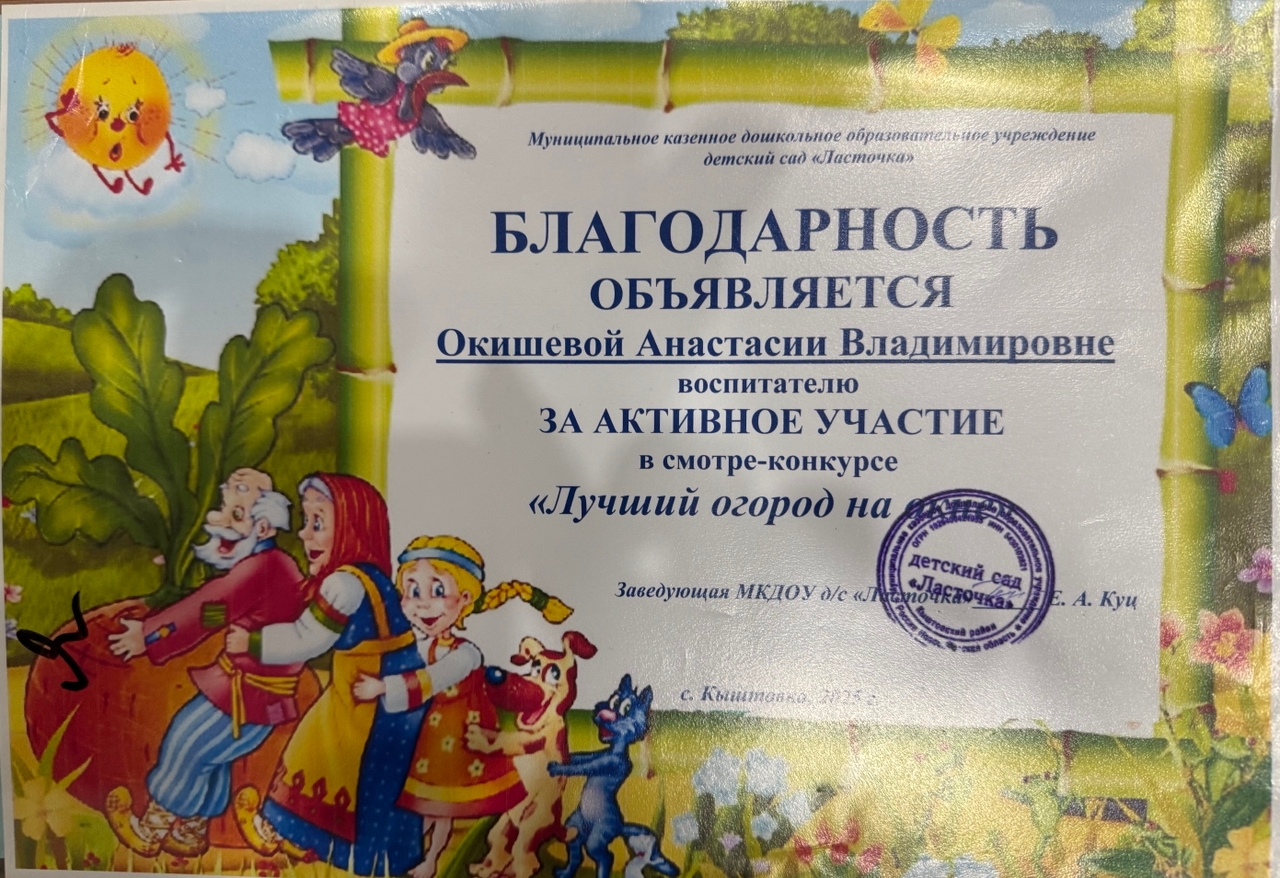Благодарность Муниципального казенного образовательного учреждения детский сад "Ласточка"