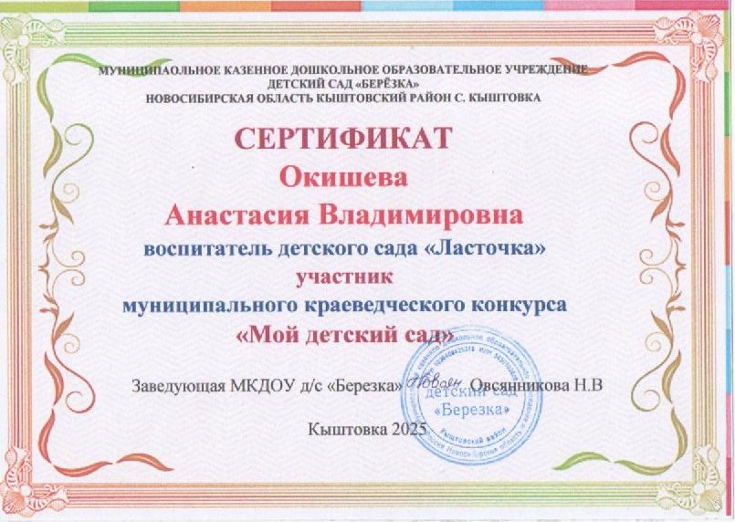 Сертификат Муниципального казенного дошкольного образовательного учреждения детского сада "Березка" Новосибирская область Кыштовский район с.Кыштовка